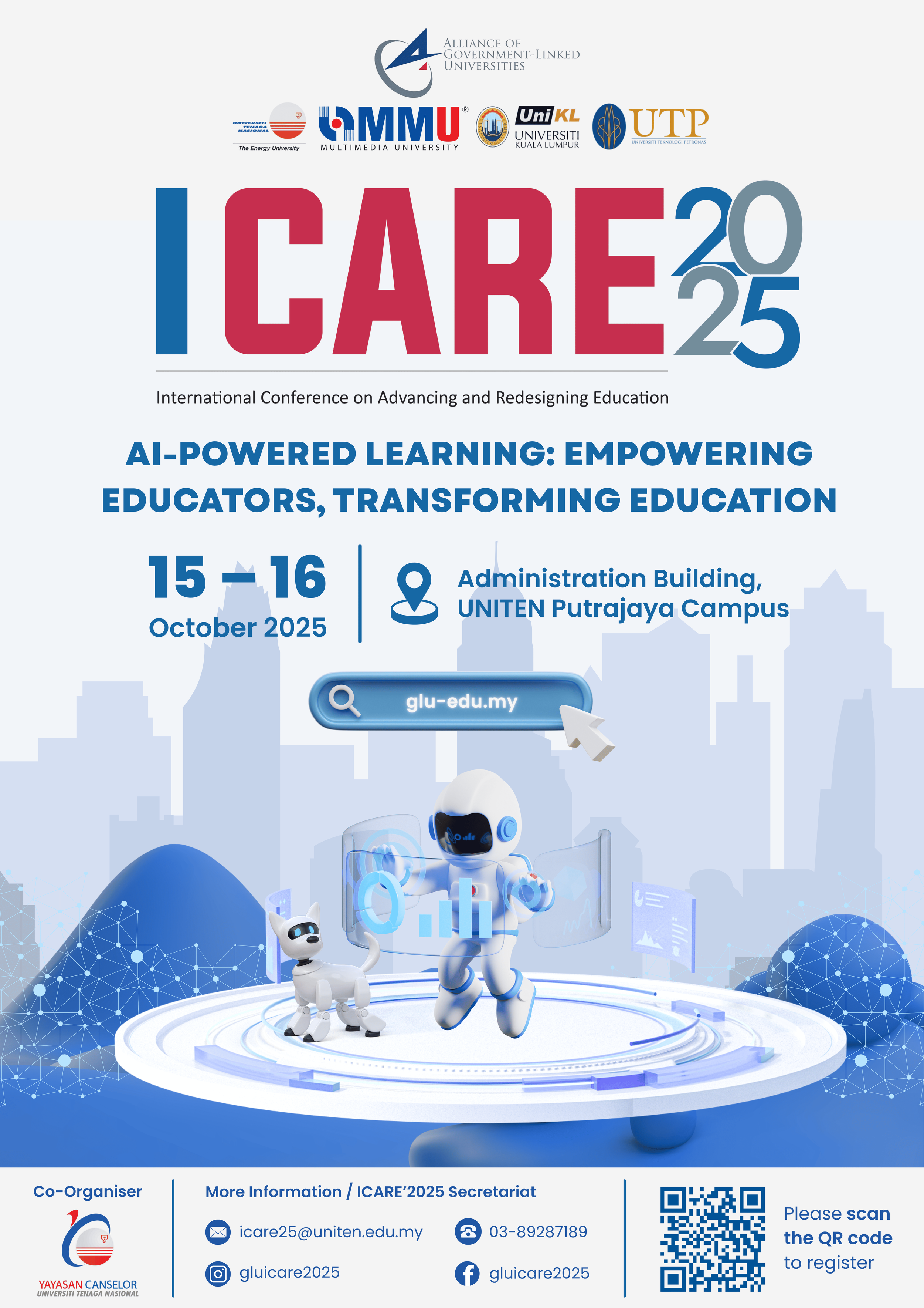We are delighted to welcome you to ICARE’25, the International Conference on Advancing and Redesigning Education, taking place from 14 to 16 October 2025 at Universiti Tenaga Nasional (UNITEN), Selangor. With the theme “AI-Powered Learning: Empowering Educators, Transforming Education,” ICARE’25 serves as a dynamic platform for educators, researchers, policymakers, and innovators. This platform enables them to explore the transformative power of artificial intelligence in reshaping the educational landscape. As a joint effort of the Government-Linked Universities (GLUs), the conference aims to inspire meaningful dialogue, share cutting-edge research, and foster collaborations. These collaborations bring together educators, researchers, and innovators who leverage AI to drive the future of learning. Join us as we delve into innovative approaches, tools, and strategies that place AI at the heart of educational advancement. These innovations empower educators and enrich learner experiences across all levels of education. We look forward to welcoming you to an engaging and impactful gathering at ICARE’25.